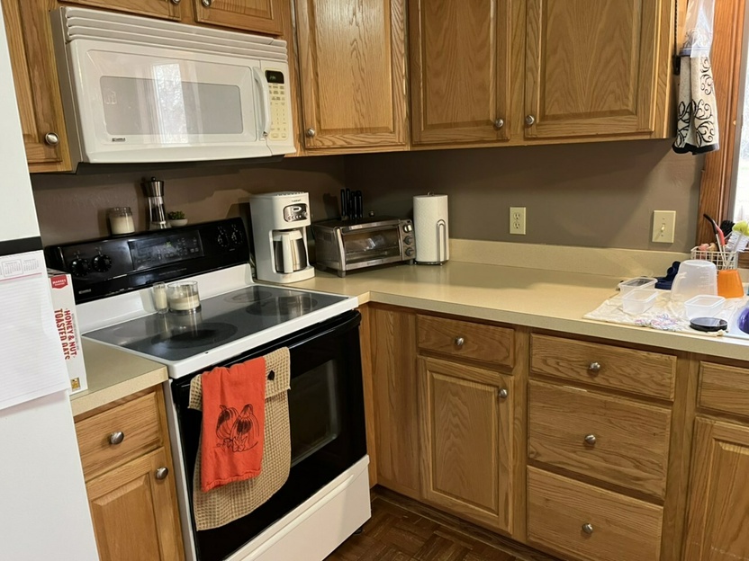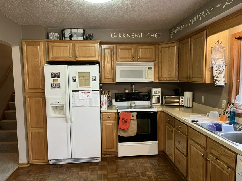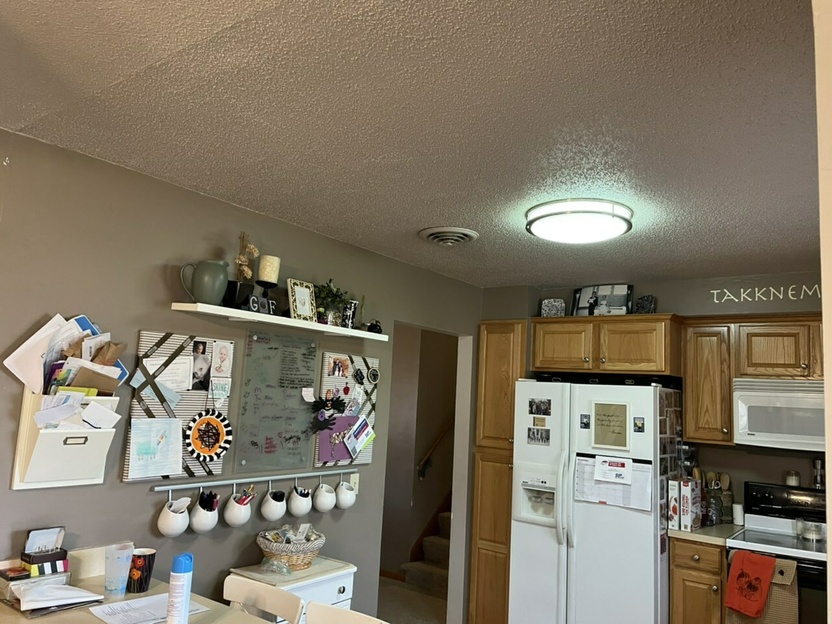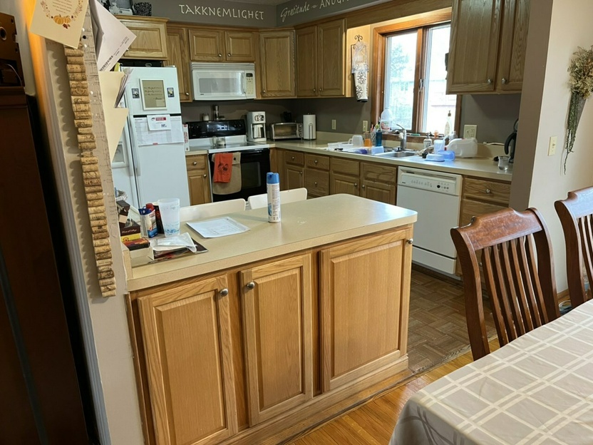 So, we removed a dividing wall in the middle of the kitchen, gutted everything, replaced carpet with hardwood flooring, designed a new multi-tiered island with a built-in convection microwave oven. Aged popcorn ceilings were replaced with new knockdown treatment and the additional lighting throughout the kitchen really enhanced the brightness and openness of the space.