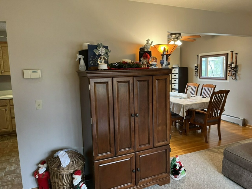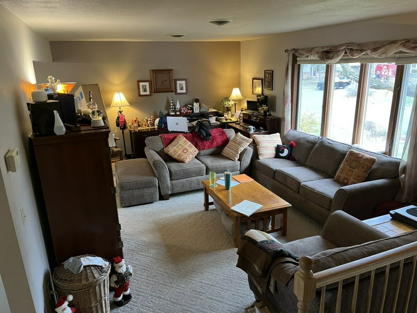 BEFORE & AFTER: We also replaced the carpeting with matching hardwood floor in a walnut stain complimentary to the decorative wall/ceiling trim.