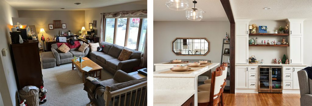 BEFORE & AFTER: With the wall gone both kitchen and living room are bathed in light. We also replaced the failing bow window with a new energy efficient Marvin series.