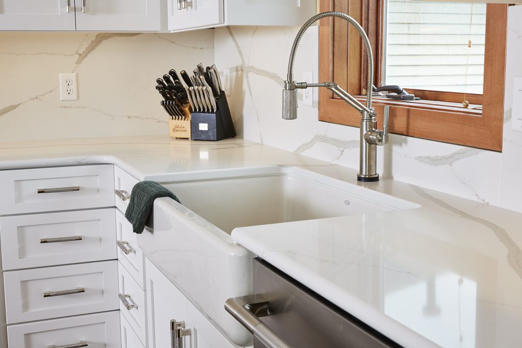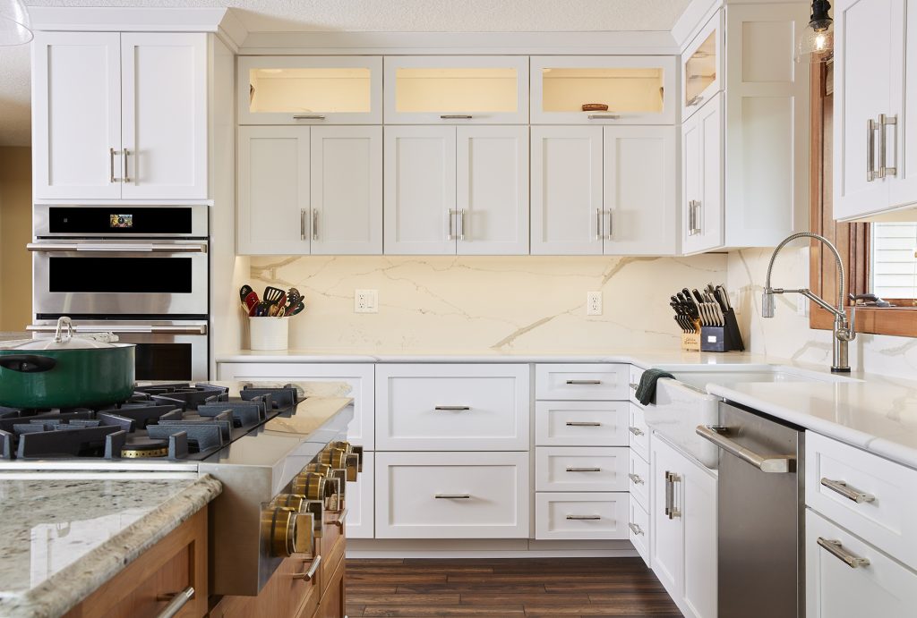 With some slight wall configurations, we reclaimed space for a coffee bar and relocated the pantry nearer the garage. We also created a much larger island, upgraded all surfaces and backsplash with a mixed use of quartz and granite and replaced all the flooring throughout the first floor.