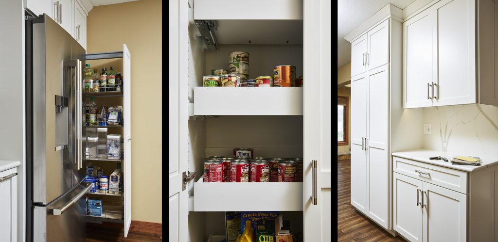 From left: Where pantry used to be there is now pull out storage next to new refrigerator. New cabinet pantry was relocated close to the garage entrance.