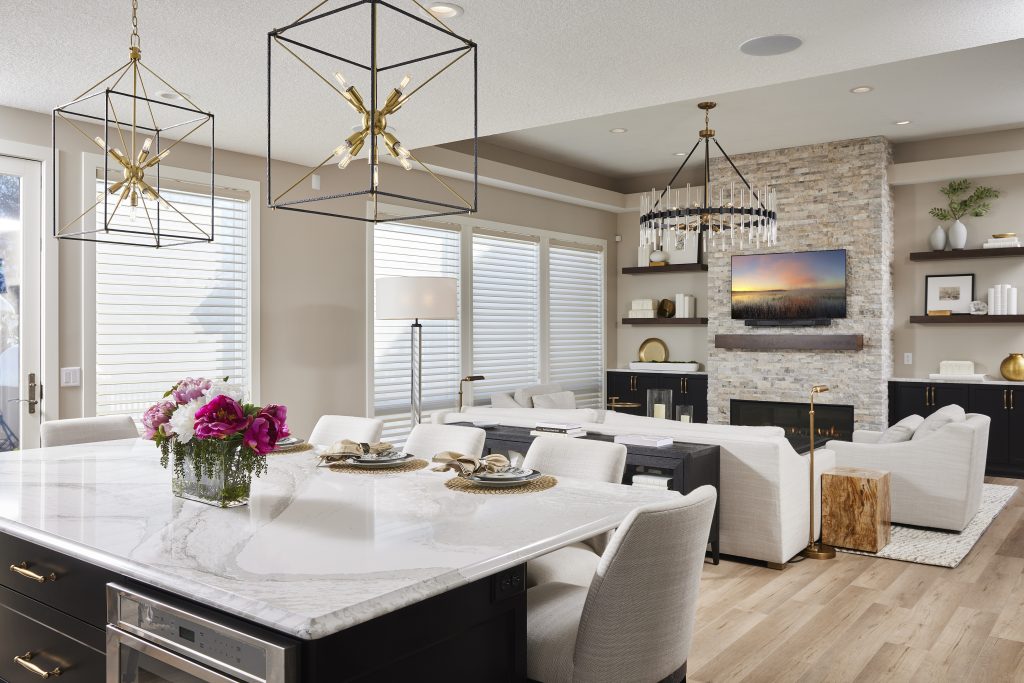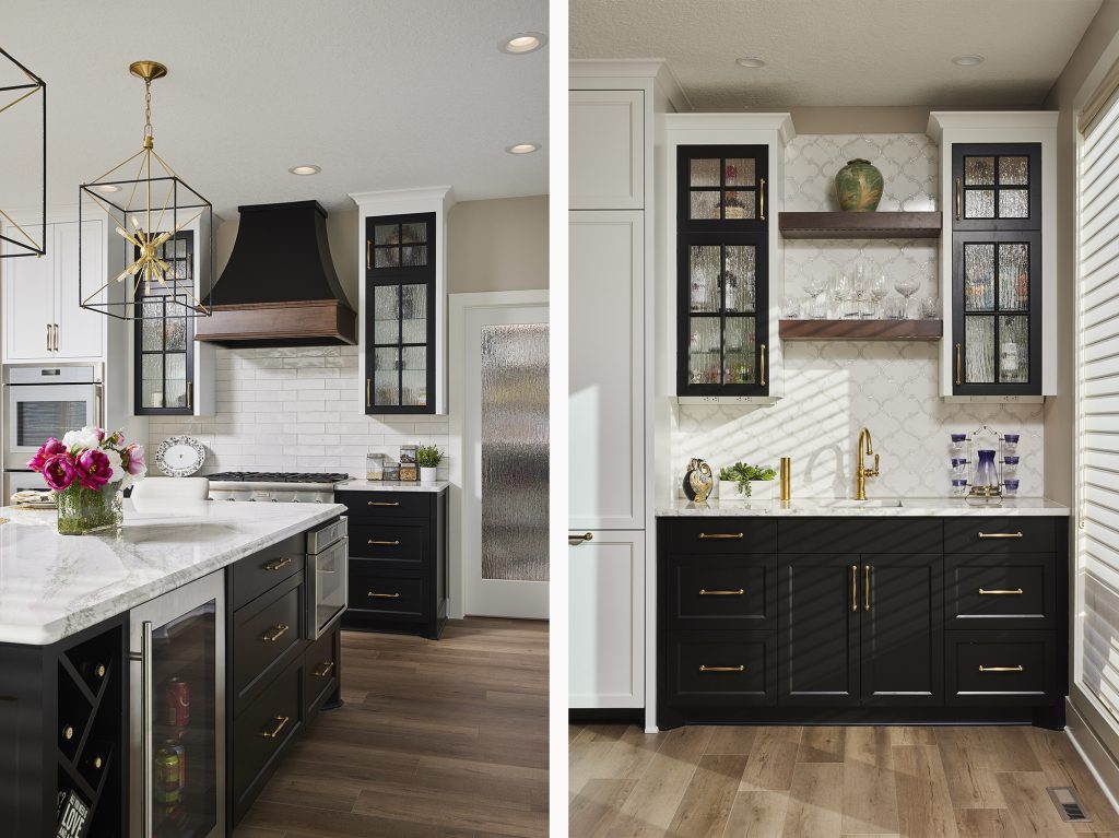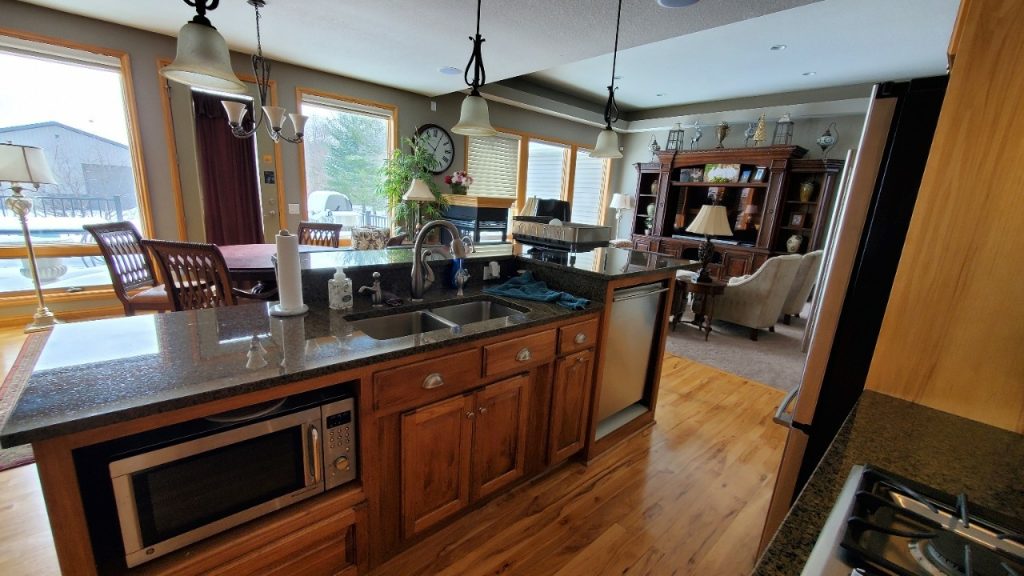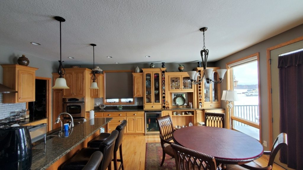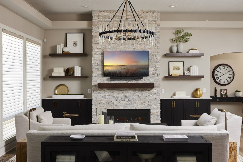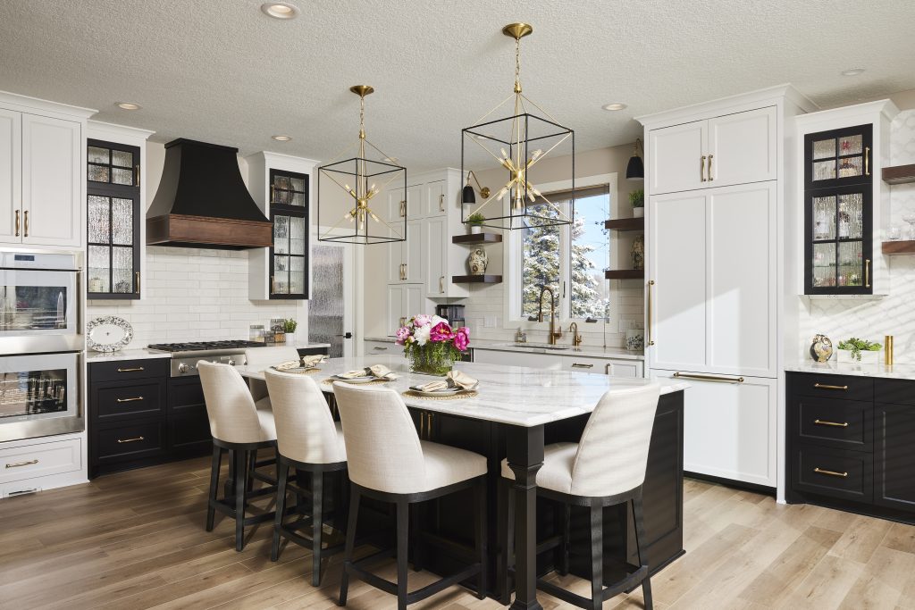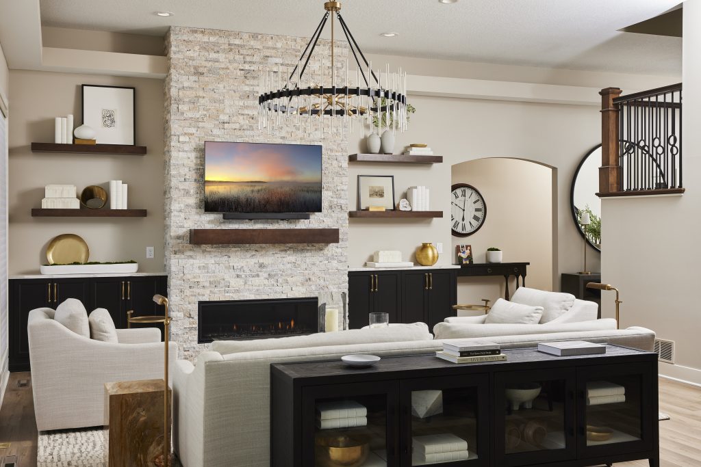 AFTER: They had always planned to put a sink under the window. Now they have it, along with an 8-foot island devoted just to meals and cooking. The 2-toned look is very popular these days as is the dedicated space set aside for beverages. The dishwasher and refrigerator now share the same plane of use as the sink. All the trim has been uniformly finished in the same paint color. Note the Thermador Star Sapphire 7-program dishwasher, which was once crammed into the center island.AFTER: Appliances include Thermador 36″ built-in 2-door bottom freezer, Thermador 36″ gas range top, Thermador 30″ double built-in oven, vent-a-hood wall mounted liner. Cabinet doors SR-106, frame: F-405, edge: square, Silvit glass, floating shelves in maple.AFTER: Thermador 24″ microdrawer; Bar: Ruvati Nesta 16″ undermount single basin, backsplash tile: Aphrodite II Dolomite Mother of Pearl Waterjet Marble Mosaic, CoreTec flooring, Miles Oak 7″ plank.AFTER: Island and perimeter Cambria Southport 3cm, Ruvati Roma 36″ undermount double basin with basin rack, basket strainer, colander, and cutting board, tile: CTW Artisan Bianco Glossy Crackle.AFTER: Flooring by CoreTec Color: Miles Oak 7″ plank, Moen Align Pull Down kitchen faucet with Motion Sense Wave technology; range hood finish: SW-6258 Tricorn Black, cabinets: SW-7005 Pure White. AFTER: Santiago 12-light chandelier in Matte Black with warm brass accents. AFTER: Walls finish SW-7043 Worldly Gray.AFTER: Mantel—Hirshfield’s stock cappuccino stain, water popped on maple; fireplace field tile Claros Silver Architectural Travertine wall tile 6×24. AFTER: Fireplace unit—Heat & Glo Mezzo 48.AFTER: Front door: African Mahogany from Great Northern; stairs: FHBSP1201 hollow black satin plain 1/2″ square balusters FHBSA1204 hollow black satin one, circle modern 1/2″ sq baluster, railing: flat bottom 9200 oak point in maple, tread caps: 807116″ RH maple return tread cap with 8076 riser cap, Hirshfield’s stock cappuccino stain, water popped maple.