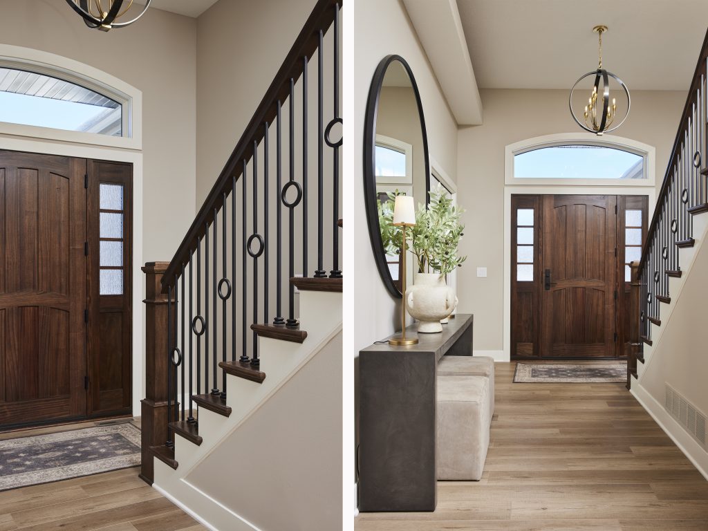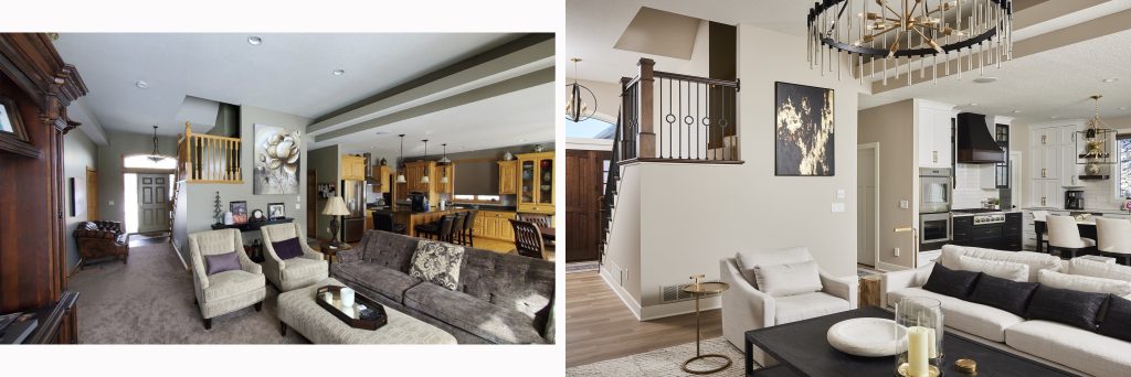 COMPARISON: Before & After—from left, new front door, flooring, ceiling, stair railings, wall paint, lighting, kitchen configuration, and color scheme.