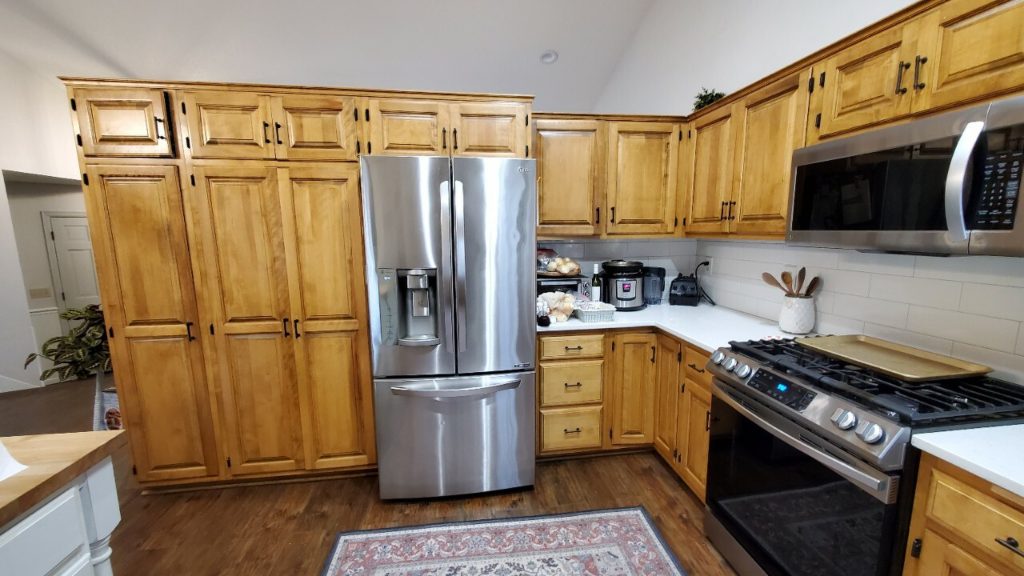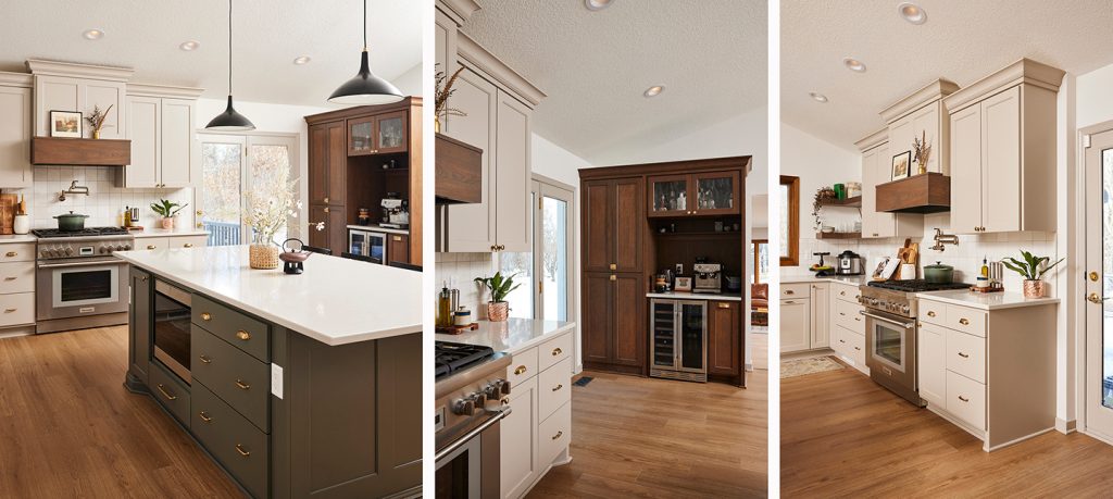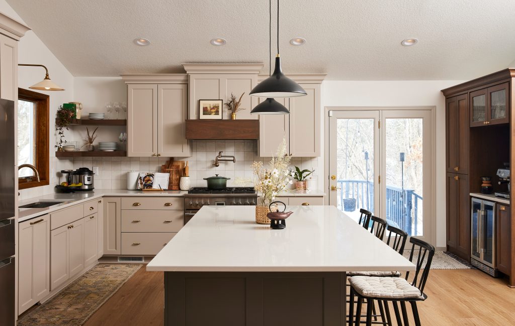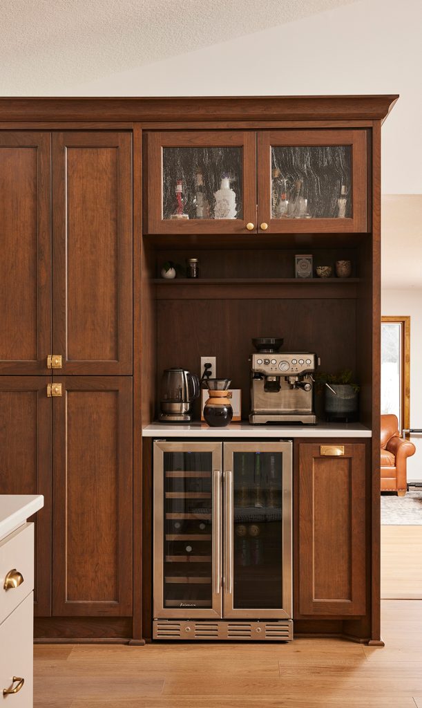 One of the challenges we had involved adding a pot filler to the range on an outer wall. That meant we had to extend the wall out 6 inches to accommodate the plumbing. The other challenge concerned utilizing the dead space to the right of the back door that was separated by a wrought iron railing. The solution was adding a short wall to hold a coffee bar, beverage center, and pantry.