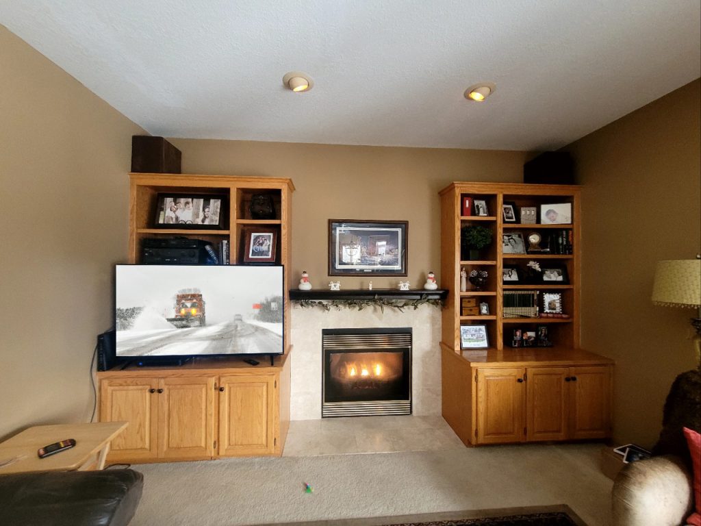 BEFORE: Family room honey oak bookshelves and fireplace surround.