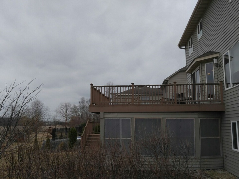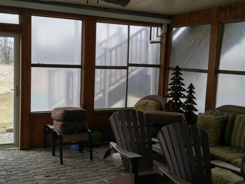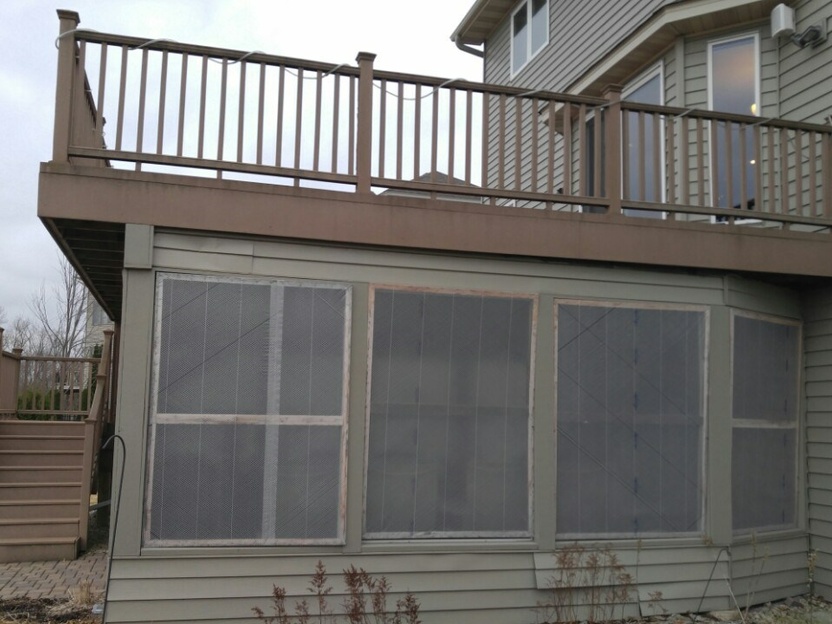 What if you want the open-air freedom of a deck, with elevated visibility, and convenient access to the ground floor, but also want protection from the elements? The solution is a tuck under 3-season porch with a 2nd story low-maintenance Azek decking, with LED illuminated powder coated aluminum bronze railings. It’s another perfect application of the Eze-Breeze® panelized membrane enclosure system that has the look of a 4-season with the protection of a 3-season porch, but for far less than a 3 or 4-season price tag. We added a unique accent wall of barn wood to anchor the room and tie in the rustic surroundings and the custom concrete floor.