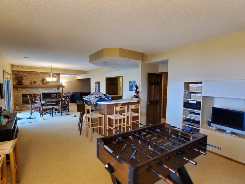 These “before” images above show how the utility of the basement space for entertainment purposes was hampered by the location of the wet bar, which divided the room in half and didn’t make any use of the natural light from the existing windows. The use of the TV/audio components, built-in into the wall behind the foosball table was also severely limited. It’s hard to watch the game through a foosball player who completely blocks the view.