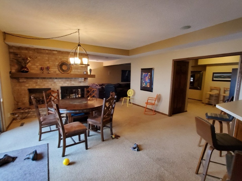 AFTER: View of new gas fireplace and lounge area with theater room in the background.