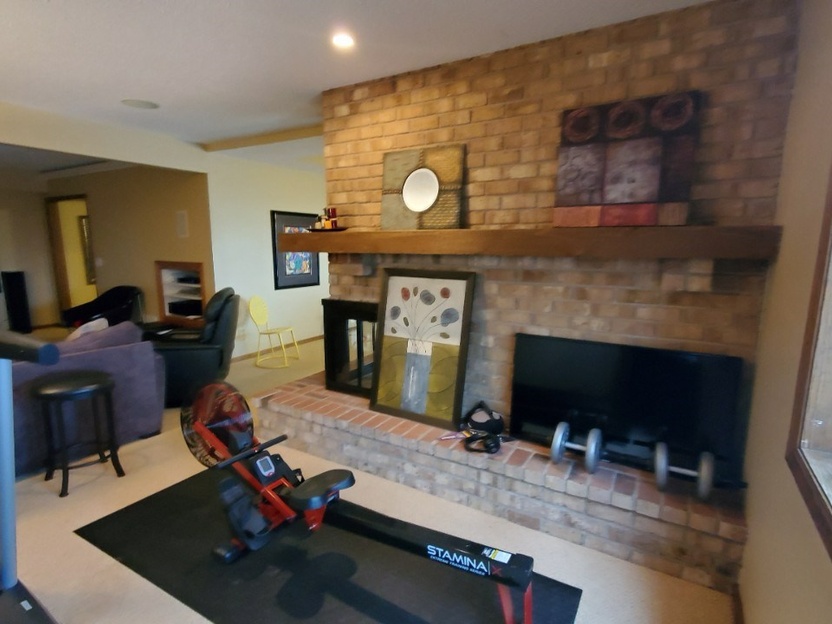AFTER: Exercise space behind the new fireplace. The New Marvin Ultra window gives tons of natural light for daily workouts. Well, weekly anyway.