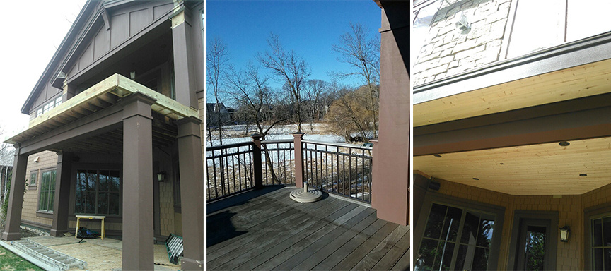 The 5-year-old exterior deck & railing was replaced with new Azek composite decking, Railcraft® Aluminum railing (Rideau Brown), and recessed LED lighting above and below the porch was added. Using the existing support columns saved time and money. the patio stones on the lower level were protected with plywood during construction.
