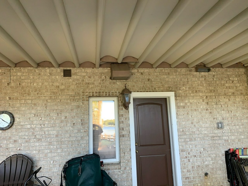 New underdeck drainage (Trek Rain Escape System) was finished off with corrugated roof panels under the deck. The composite beaded ceiling (Azek/Royal) under the stairs diverts water from the area, as well as being aesthetically pleasing.